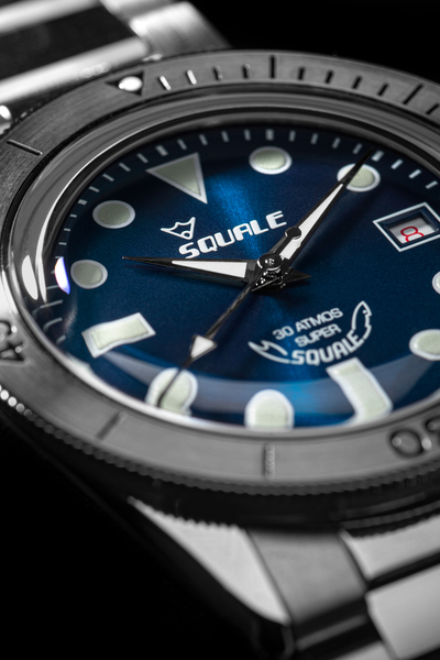 Niebieski cyferblat divera Squale przyciąga wzrok, głównie za sprawą zestawu prostych, jasnych indeksów, oraz wskazówek tej samej barwy. Pokrycie tych elementów warstwą powłoki luminescencyjnej SuperLuminova C3 czyni odczyt godziny łatwym i przyjemnym, nawet w otoczeniu podwodnych ciemności. Krawędzią cyferblatu biegnie delikatna, biała podziałka minutowa. W miejscu indeksu godziny 3 widnieje okienko datownika, wskazującego bieżący dzień miesiąca. Powierzchnię tarczy ozdabia logo marki Squale, wraz z informacją o kolekcji oraz poziomie wodoszczelności.