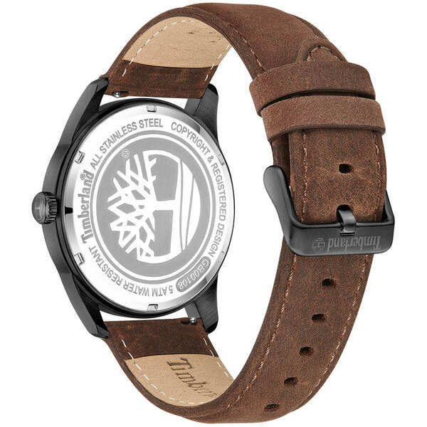 Wodoszczelność określono na 50m, dzięki czemu czasomierz nie odniesie obrażeń przy okazji drobnych zachlapań. Spód koperty wieńczy dekiel z wygrawerowanym nań logiem marki Timberland.