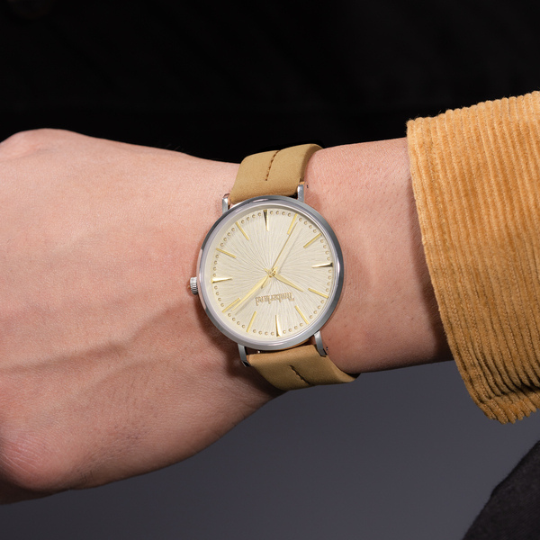 Beżowa tarcza tego zegarka emanuje delikatną elegancją, jednocześnie dodając indywidualnego charakteru. Odczyt czasu jest prosty dzięki klasycznym wskazówkom.