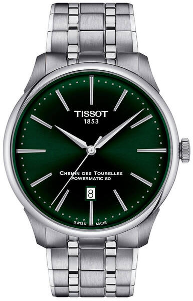 Projektując gustowną tarczę męskiego zegarka Tissot Chermin des Tourelles Powermatic 80 T.139.407.11.091.00 twórcy zadecydowali o zabarwieniu jej powierzchni na kolor głębokiej zieleni. Uzyskany za jego sprawą niesamowity klimat zegarka dodatkowo podkreślają srebrne indeksy i wskazówki, tworzące z ciemną tarczą kontrast który ułatwi Ci odczyt godziny.