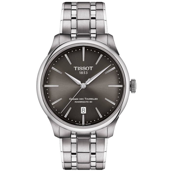 Projektując gustowną tarczę męskiego zegarka Tissot Chermin des Tourelles Powermatic 80 T139.807.11.061.00 twórcy zadecydowali o zabarwieniu jej powierzchni na kolor ciemnoszary. Uzyskany za jego sprawą niesamowity klimat zegarka dodatkowo podkreślają srebrne indeksy i wskazówki, tworzące z ciemną tarczą kontrast który ułatwi Ci odczyt godziny.