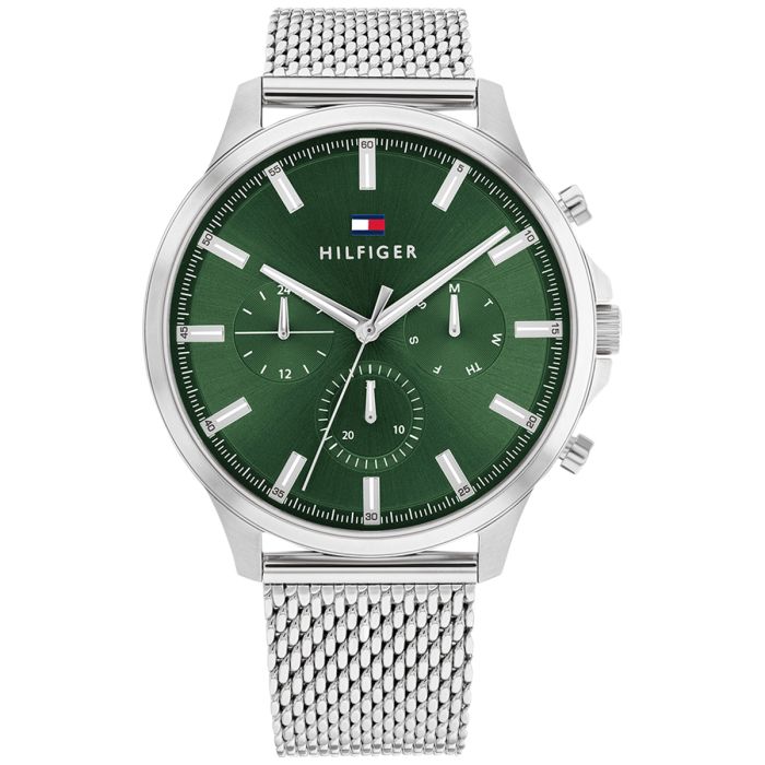 Zielona tarcza zegarka Tommy Hilfiger 1710499 przyciąga wzrok swoim głębokim kolorem, nadając modelowi unikalnego charakteru. Analogowy system wskazań czasu, w połączeniu z powłoką luminescencyjną, zapewnia doskonałą czytelność w każdych warunkach. Zegarek wyposażony jest w funkcję czasu dobowego 12/24h oraz datownik, który pokazuje dzień miesiąca i nazwę dnia tygodnia, co czyni go praktycznym dodatkiem na co dzień. Tarczę chroni szkło mineralne, odporne na zarysowania i stłuczenia, co gwarantuje długą trwałość i estetykę.
