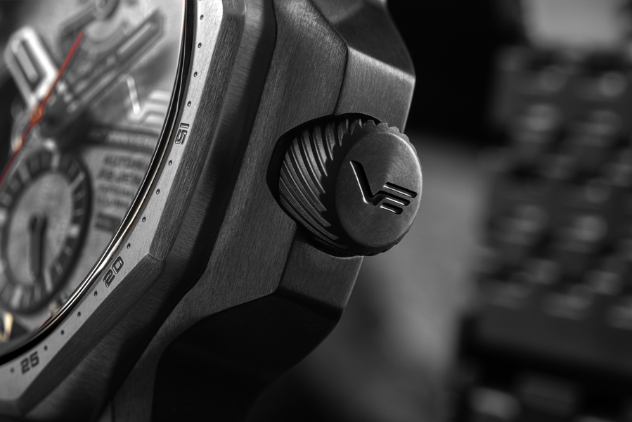 Koperta tego zegarka to prawdziwe dzieło sztuki. Wykonana z wytrzymałej stali szlachetnej 316L pokrytej szarą powłoką PVD, prezentuje nie tylko niezwykłą trwałość, ale także estetyczny wygląd. Wykorzystanie tego materiału zapewnia czasomierzowi wyjątkową odporność nie tylko na uszkodzenia mechaniczne, ale również przeciwko powstawaniu korozji. Koperta posiada oryginalny, ośmiokątny kształt, co nadaje zegarkowi niepowtarzalnego charakteru.