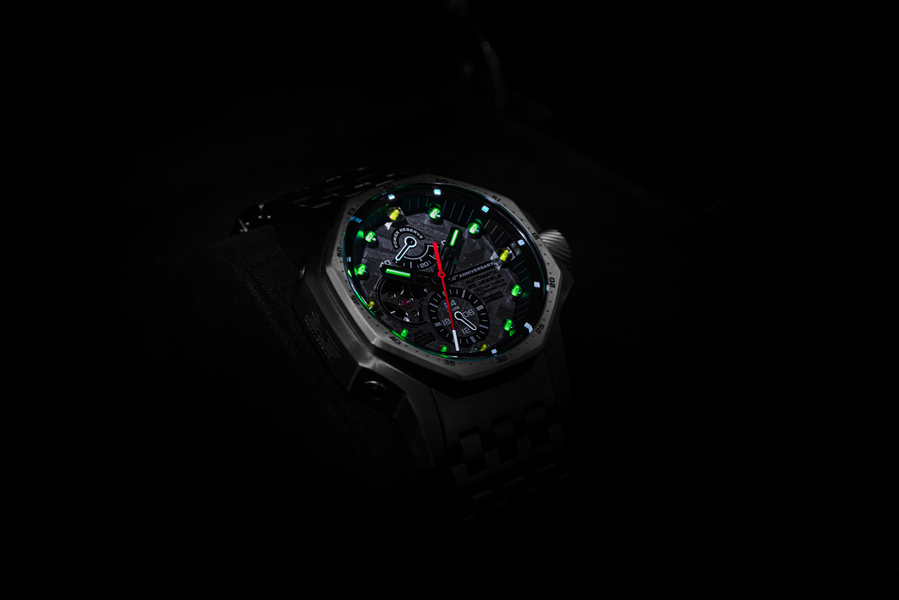 Zarówno wskazówki, jak i biegnące krawędzią indeksy zostały podkreślone za pomocą mikrorurek trytowych, zapewniających najbardziej niezawodny rodzaj podświetlenia tarczy w obecnym zegarmistrzowstwie. Przy minimalnym naświetlaniu, system ten będzie działał przez całe następne ćwierćwiecze.