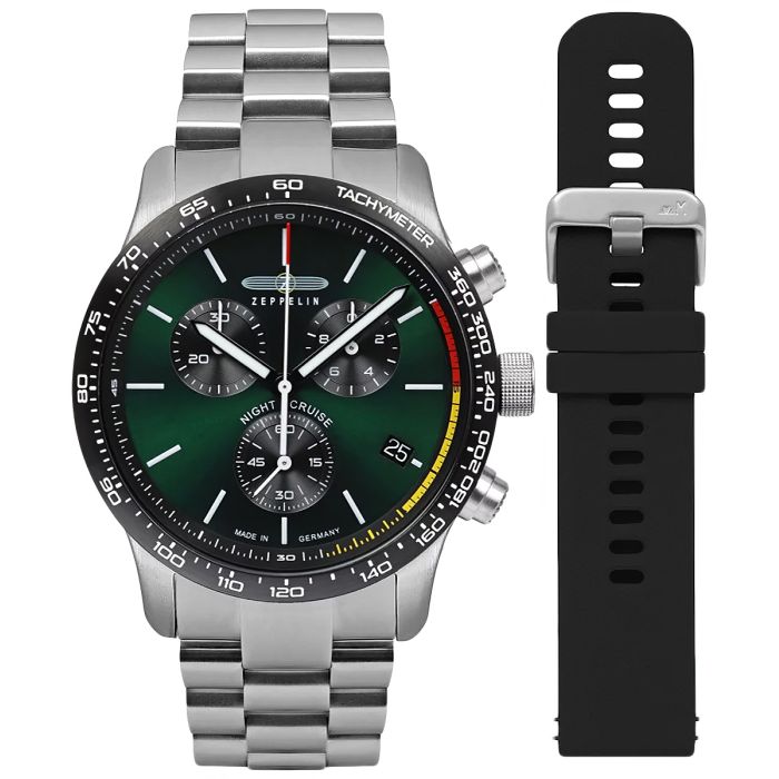 Lśniąca tarcza tego zegarka męskiego ma zielony kolor. Umieszczono na niej subtelne srebrne indeksy oraz stylizowane, białe wskazówki. Na godzinie czwartej znajduje się datownik wskazujący na aktualny dzień miesiąca. Na cyferblacie czasomierza widoczny jest także chronograf, pozwalający na dokładny pomiar interwałów czasu. Do ochrony tarczy wykorzystano szkło mineralne. Dzięki swojej elastyczności zapewnia powierzchni czasomierza wysoką odporność na pęknięcia.